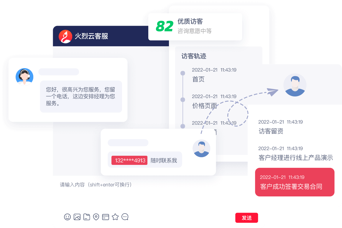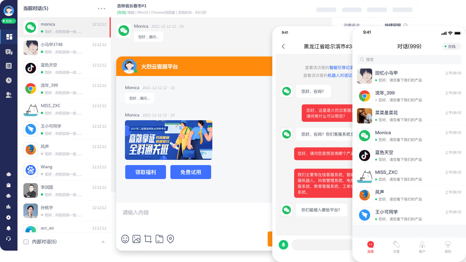 客服系统可实现主动营销。包括访客来访/轨迹/行为分析/访客评估。智能机器人全天精准推送不漏掉一个用户,服务效率提升300%