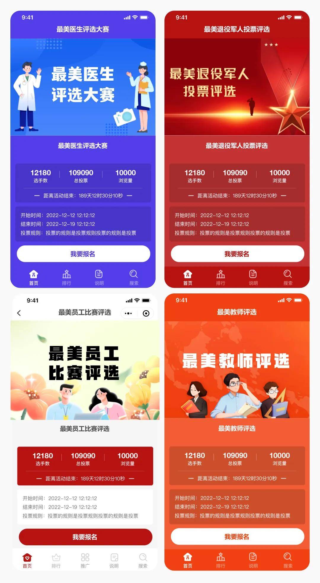上面4套主题适合最美教官投票评选大赛,同时也可以找到客服帮您制作好看的封面来适合更多的最美教官相关的投票评选大赛。
