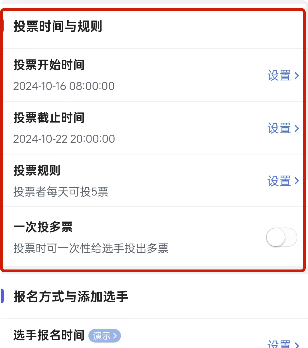 高级设置:作为投票创建者,你可以在这里设置选手报名信息、主办方设置等高级选项。