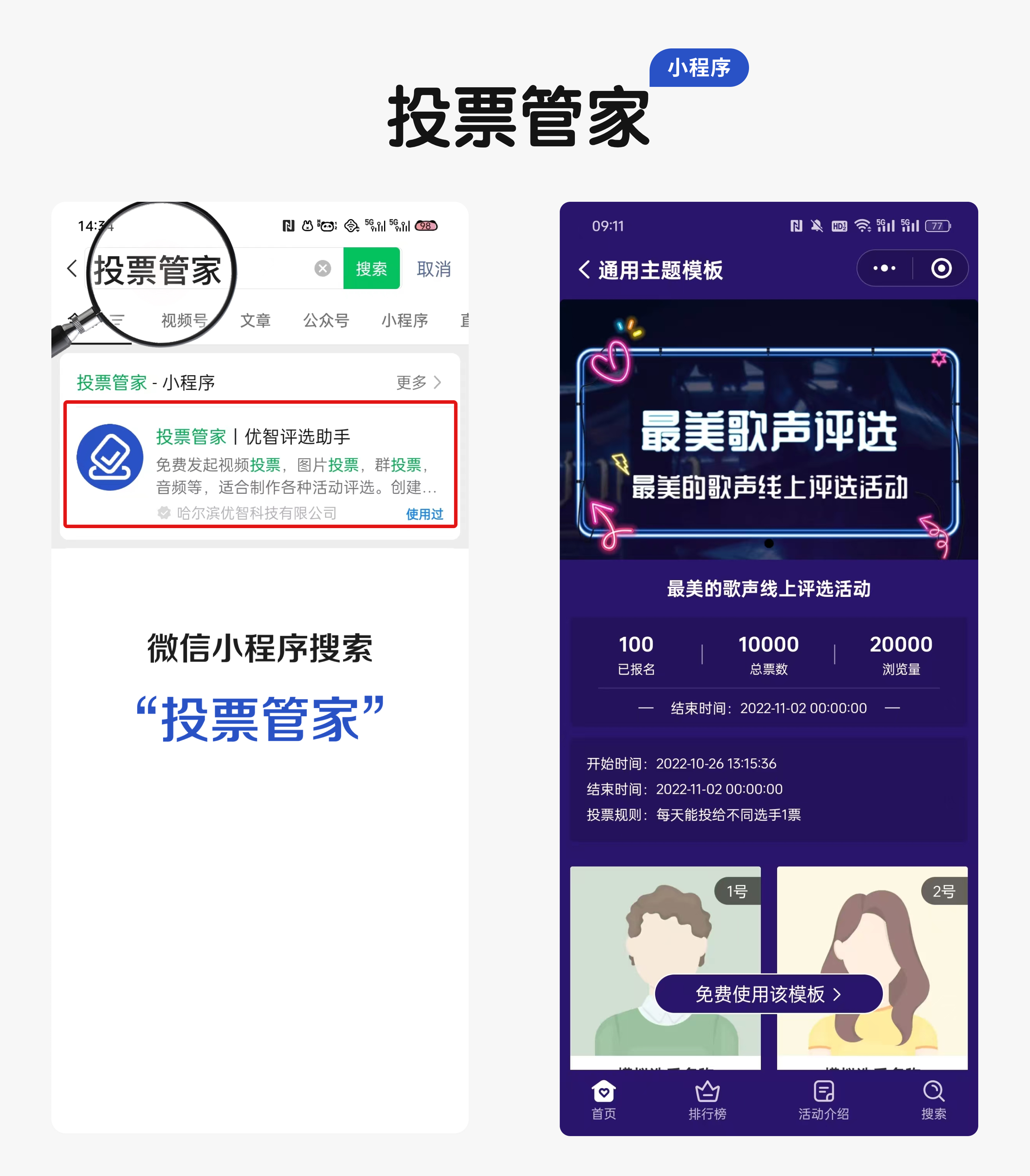 (1)确定投票工具:搜索投票管家小程序,该小程序提供了丰富的模板供您选择。
