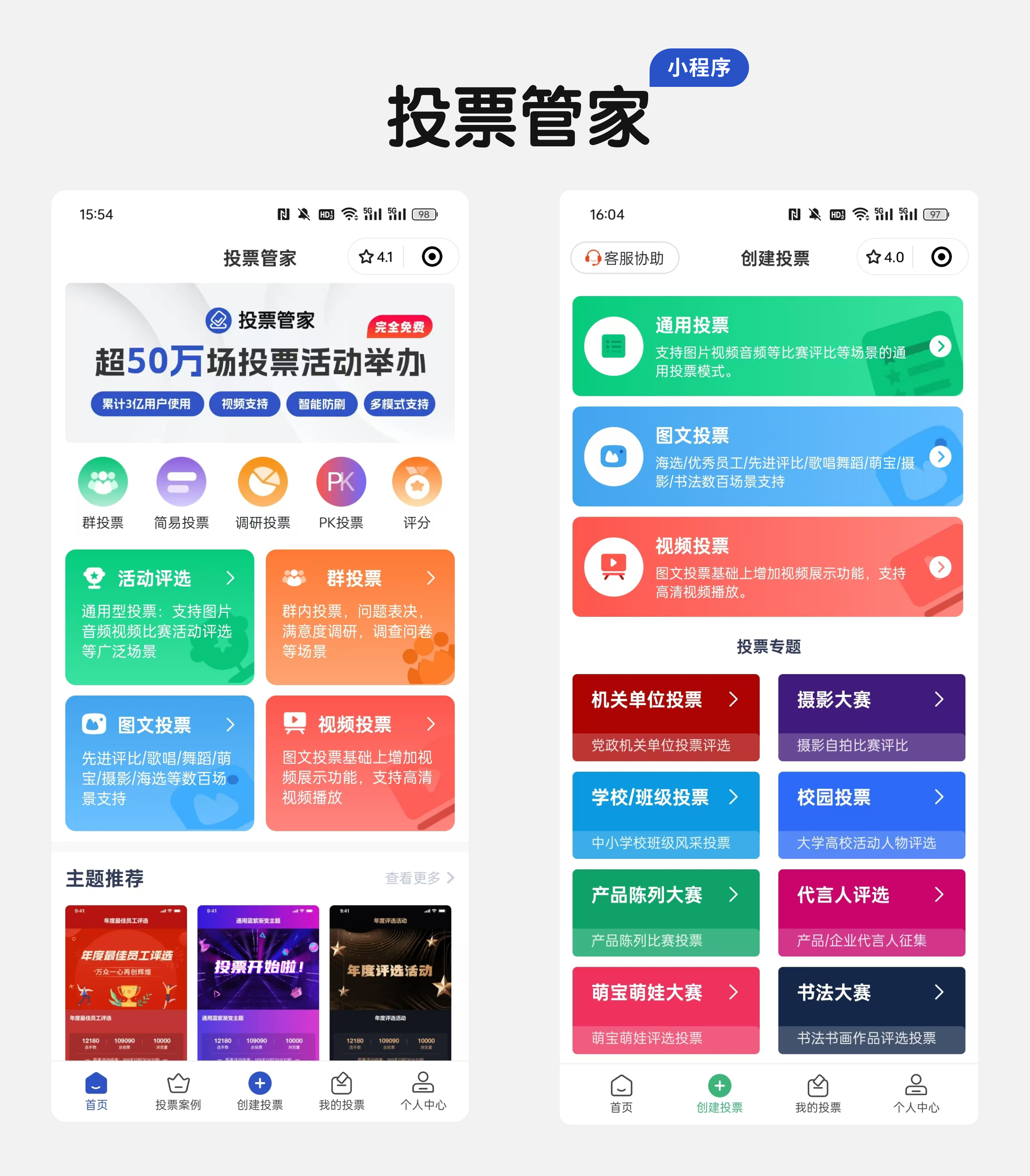 进入投票管家小程序后,根据个人或团队需求,选择合适的投票类型,如群投票、图文投票、视频投票、调研投票或评分投票等。
