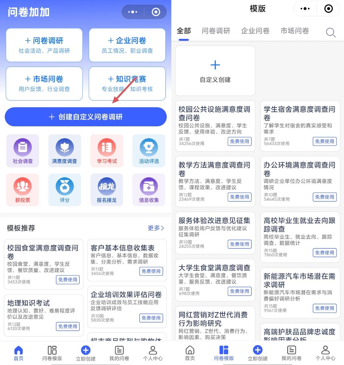 进入小程序首页,可选择 “新建问卷” 自由创作,或从问卷模板库中,挑选适配模板快速搭建问卷。