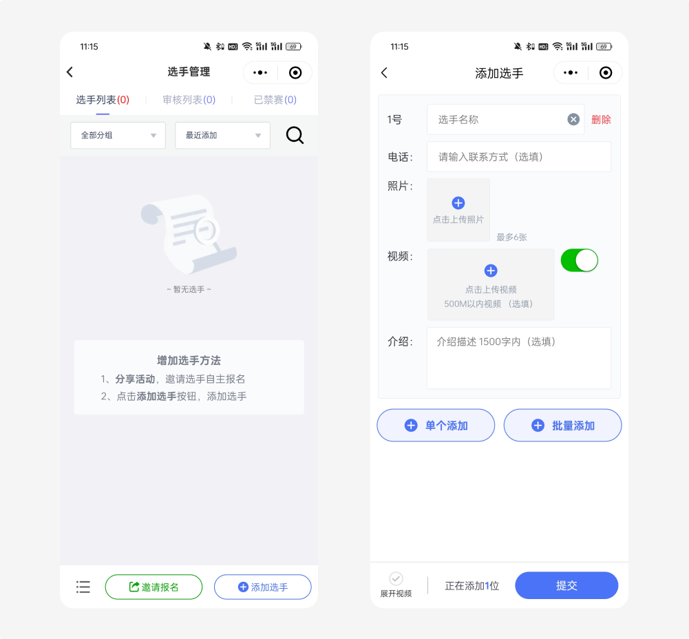 点击“添加选手”,有两种上传方式: